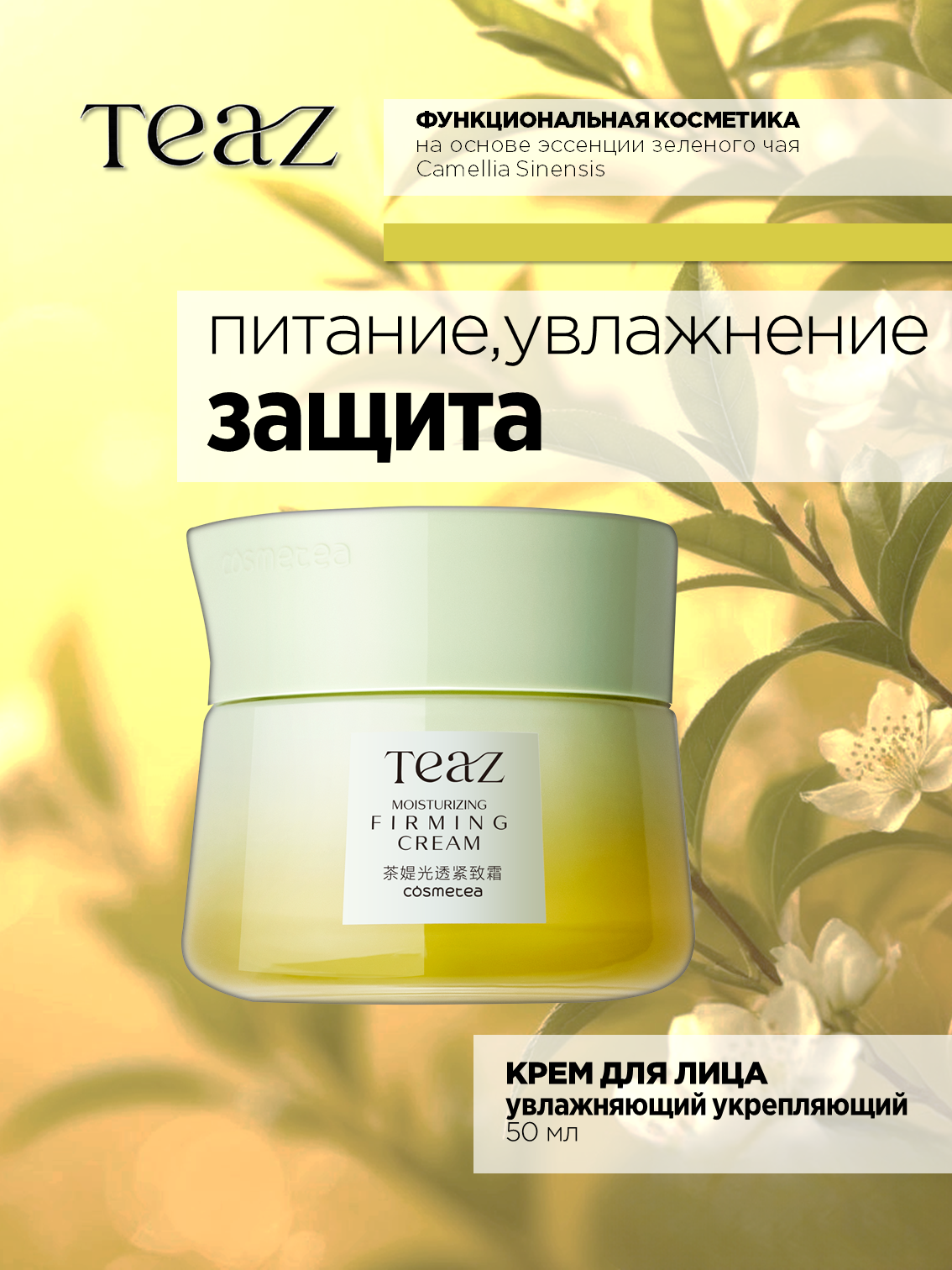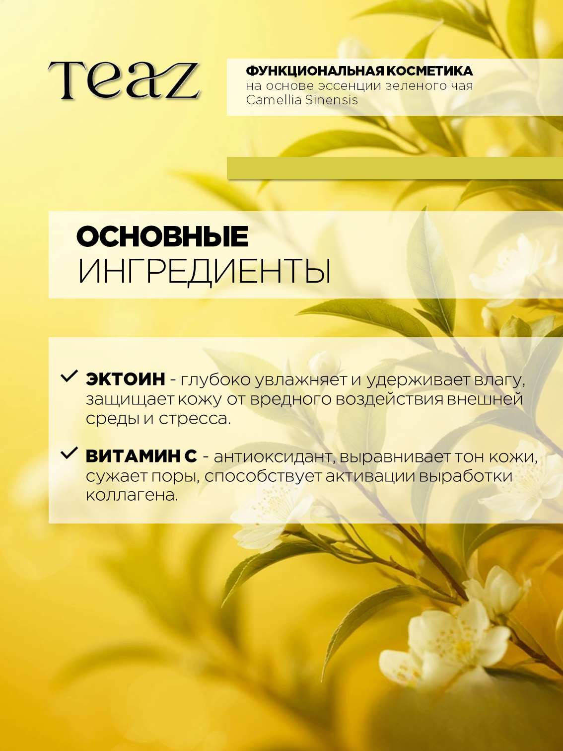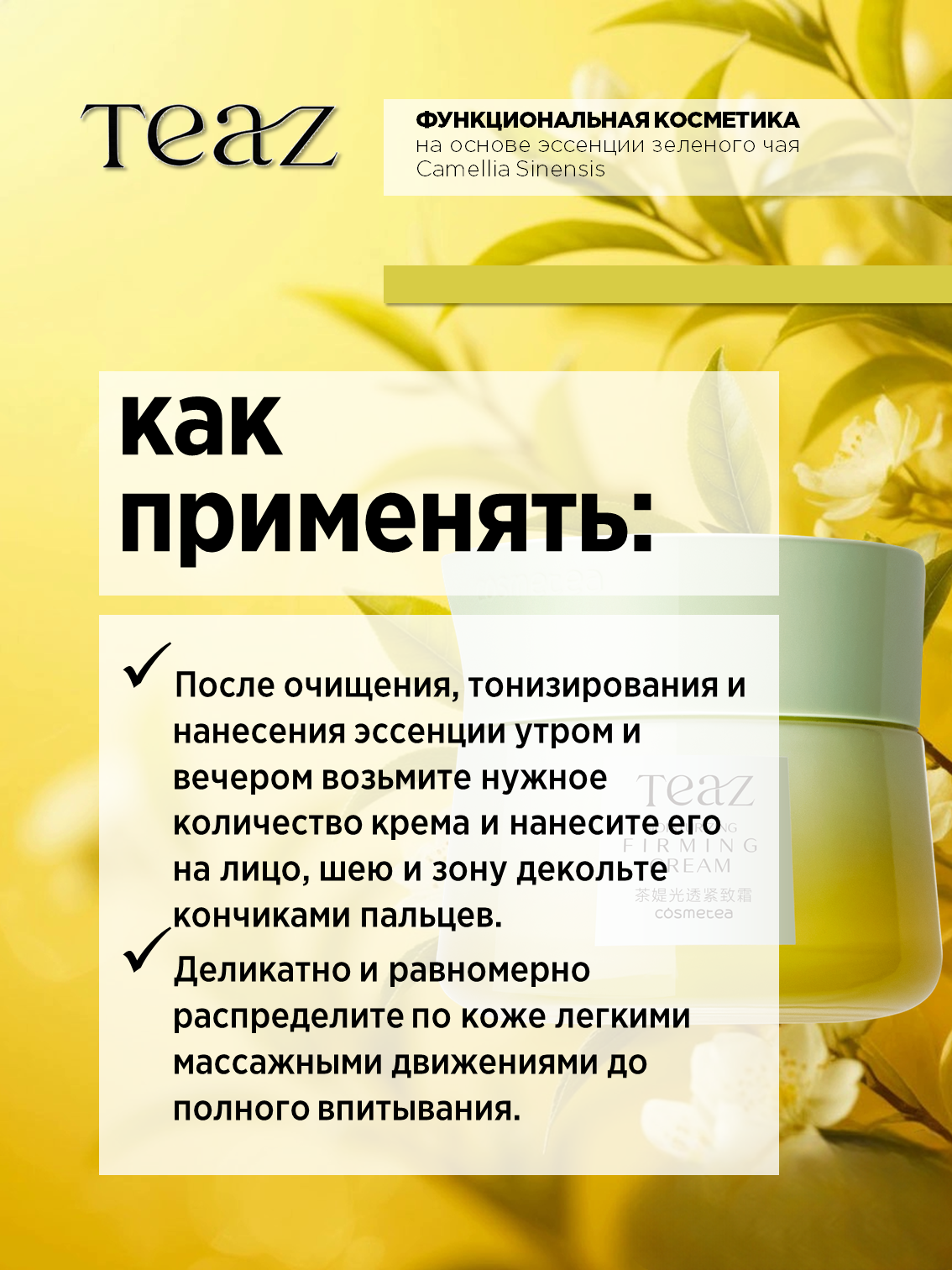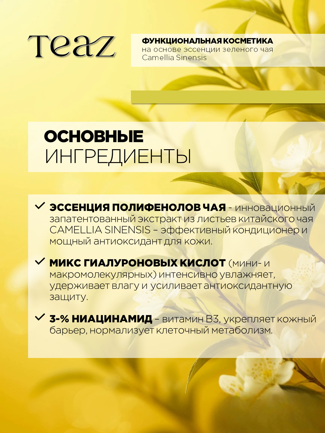 Формула TEAZ с полифенолами, получаемыми из китайского чая, обеспечивает эффективный антиоксидантный уход, защиту от свободных радикалов, обладает увлажняющим и омолаживающим эффектом, защищает кожу от неблагоприятного воздействия внешней среды.