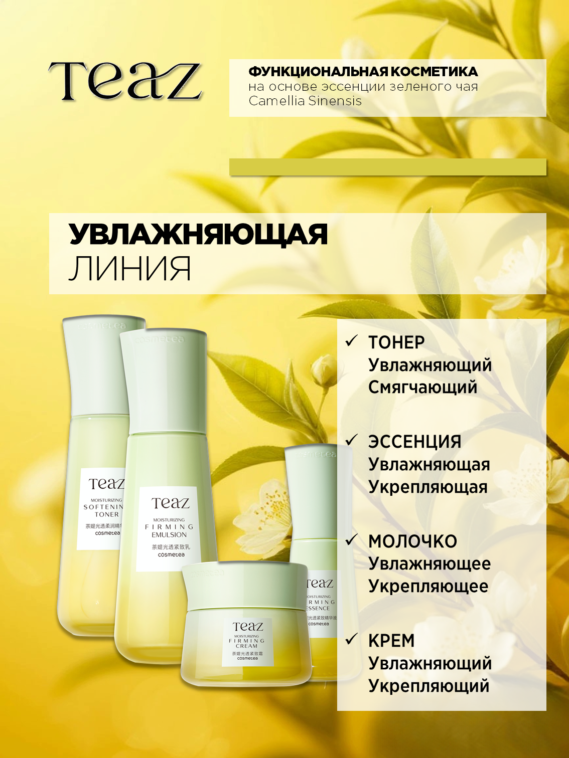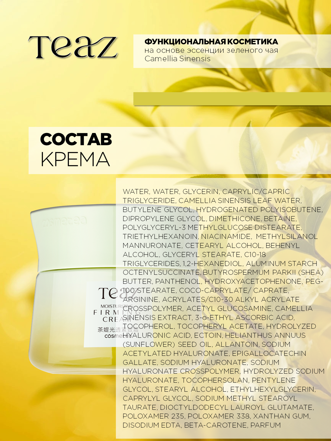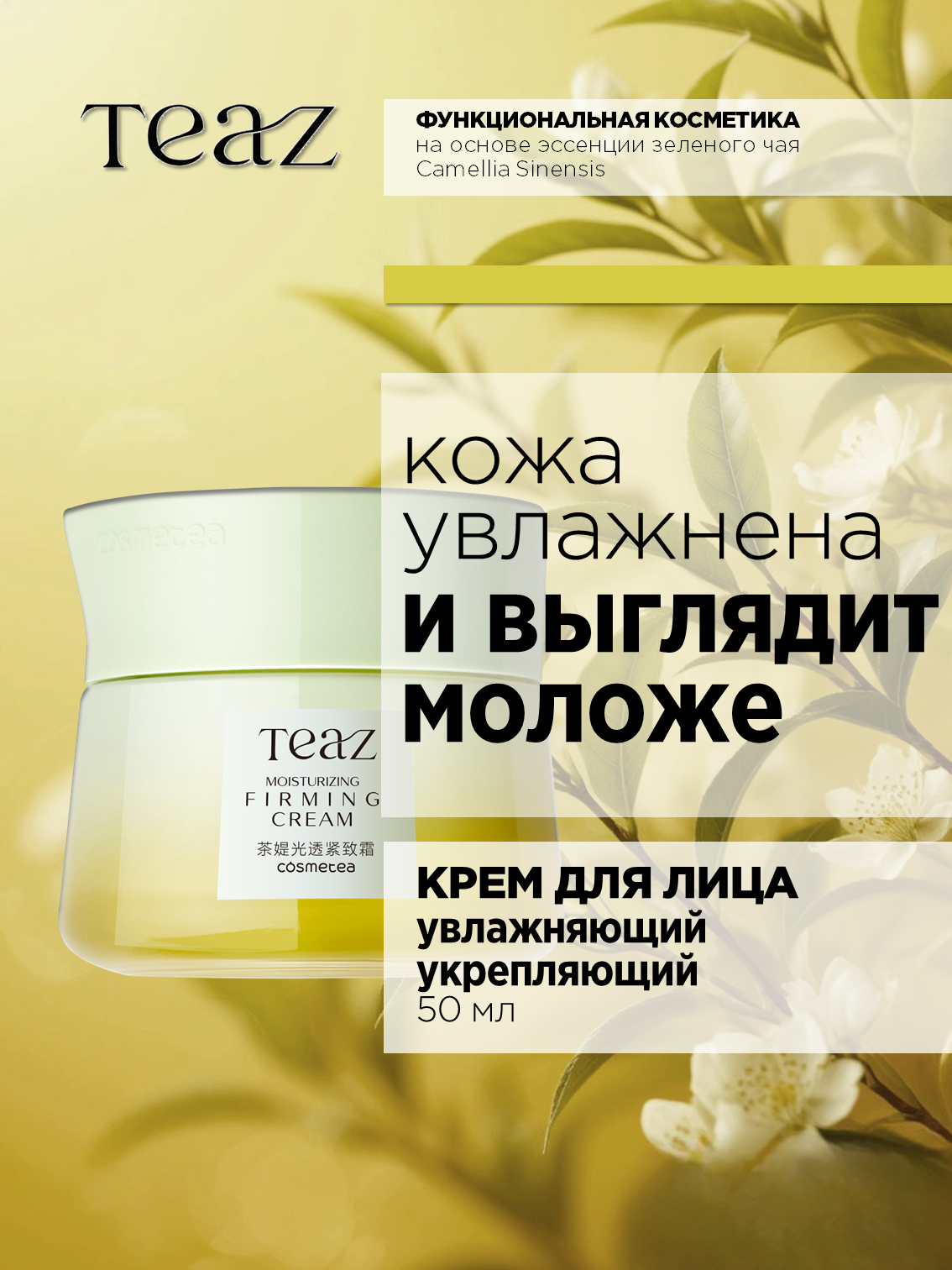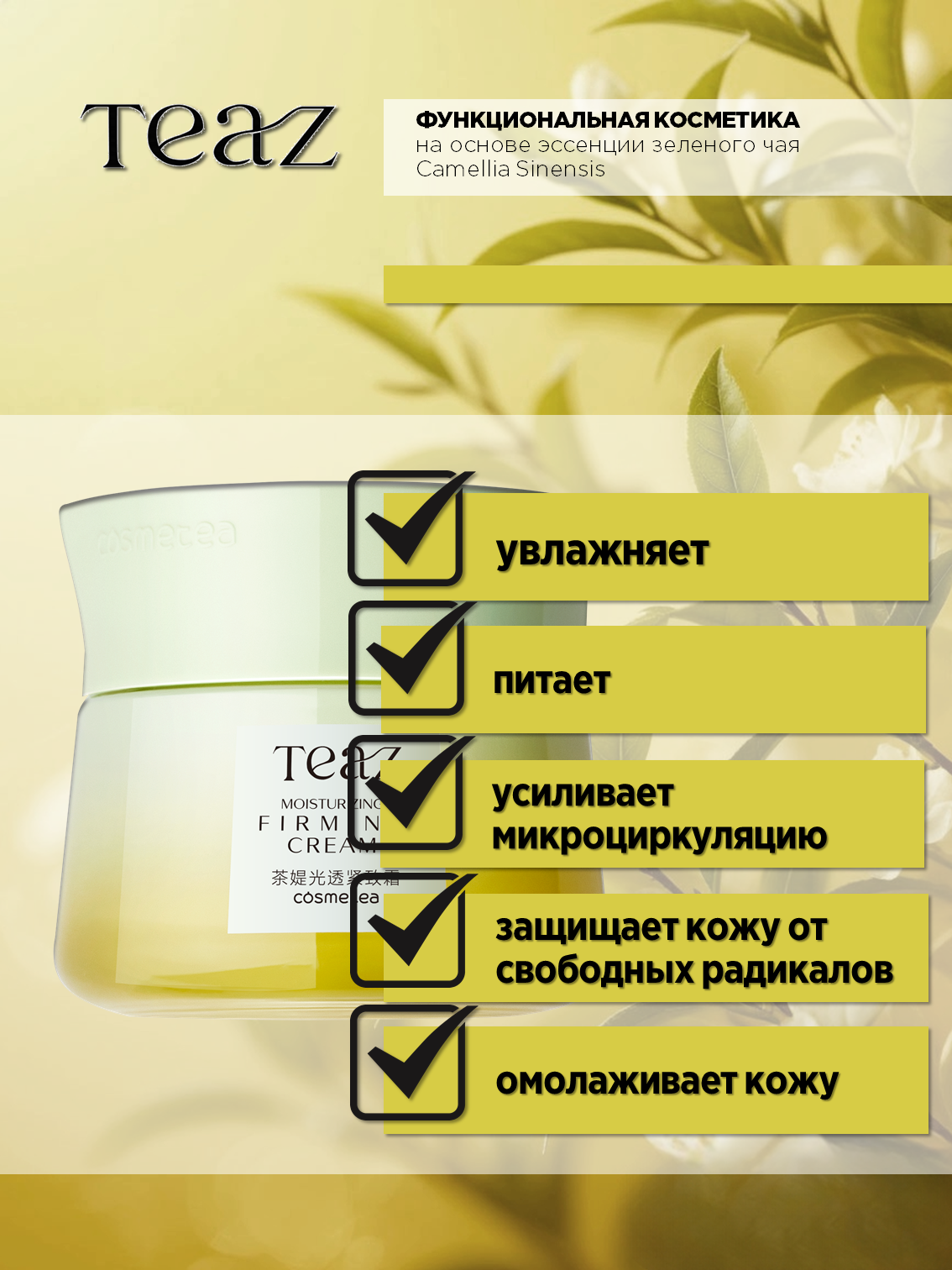 Формула TEAZ с полифенолами, получаемыми из китайского чая, обеспечивает эффективный антиоксидантный уход, защиту от свободных радикалов, обладает увлажняющим и омолаживающим эффектом, защищает кожу от неблагоприятного воздействия внешней среды.