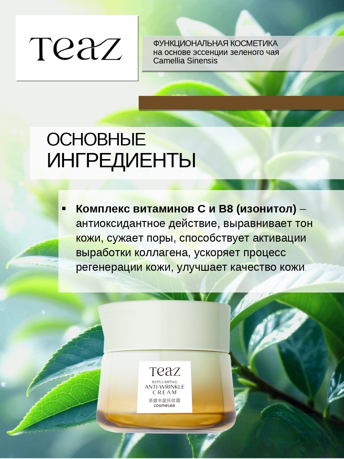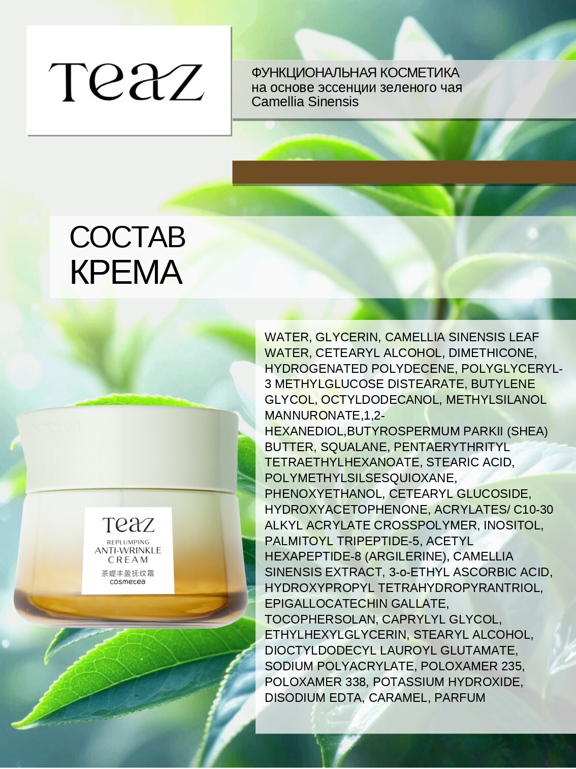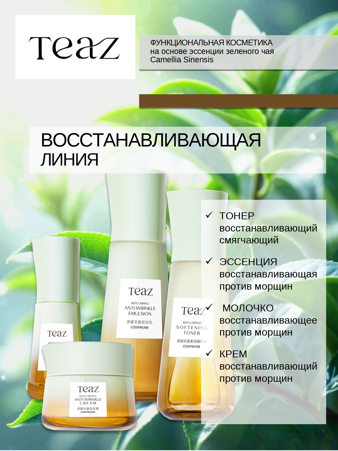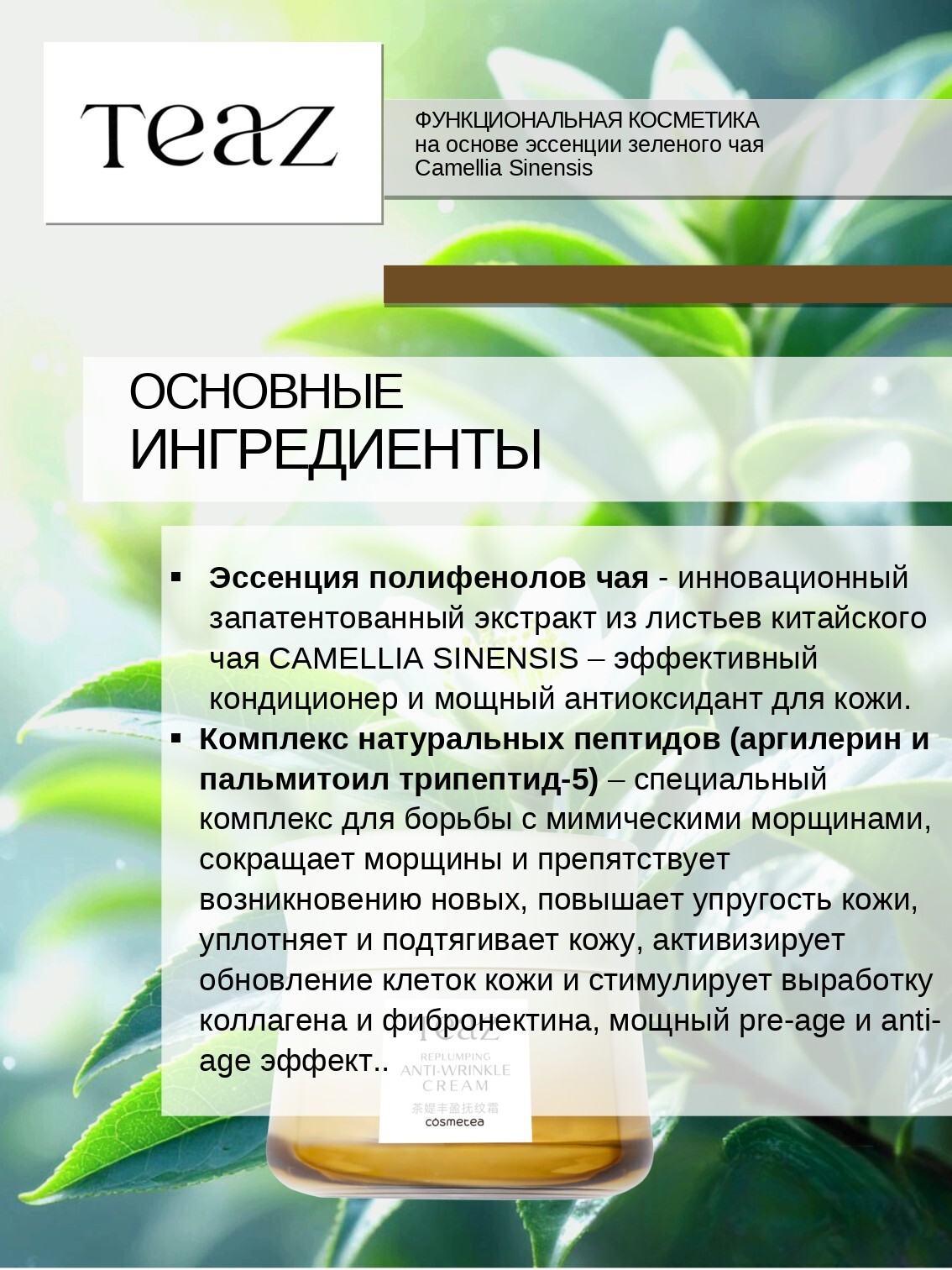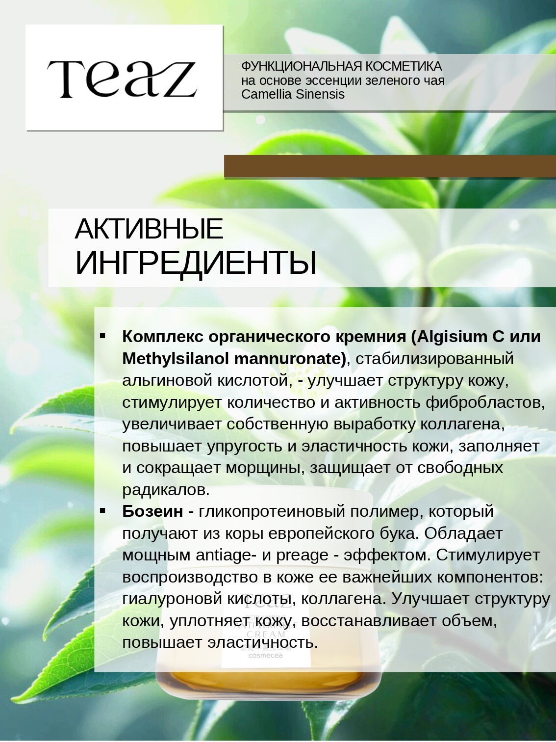 Формула TEAZ для восстановления кожи дополнительно содержит активные натуральные пептиды, которые стимулируют синтез собственного коллагена в коже, повышают плотность коллагеновых и эластиновых волокон, что способствует подтягиванию кожи и сокращению морщин.
