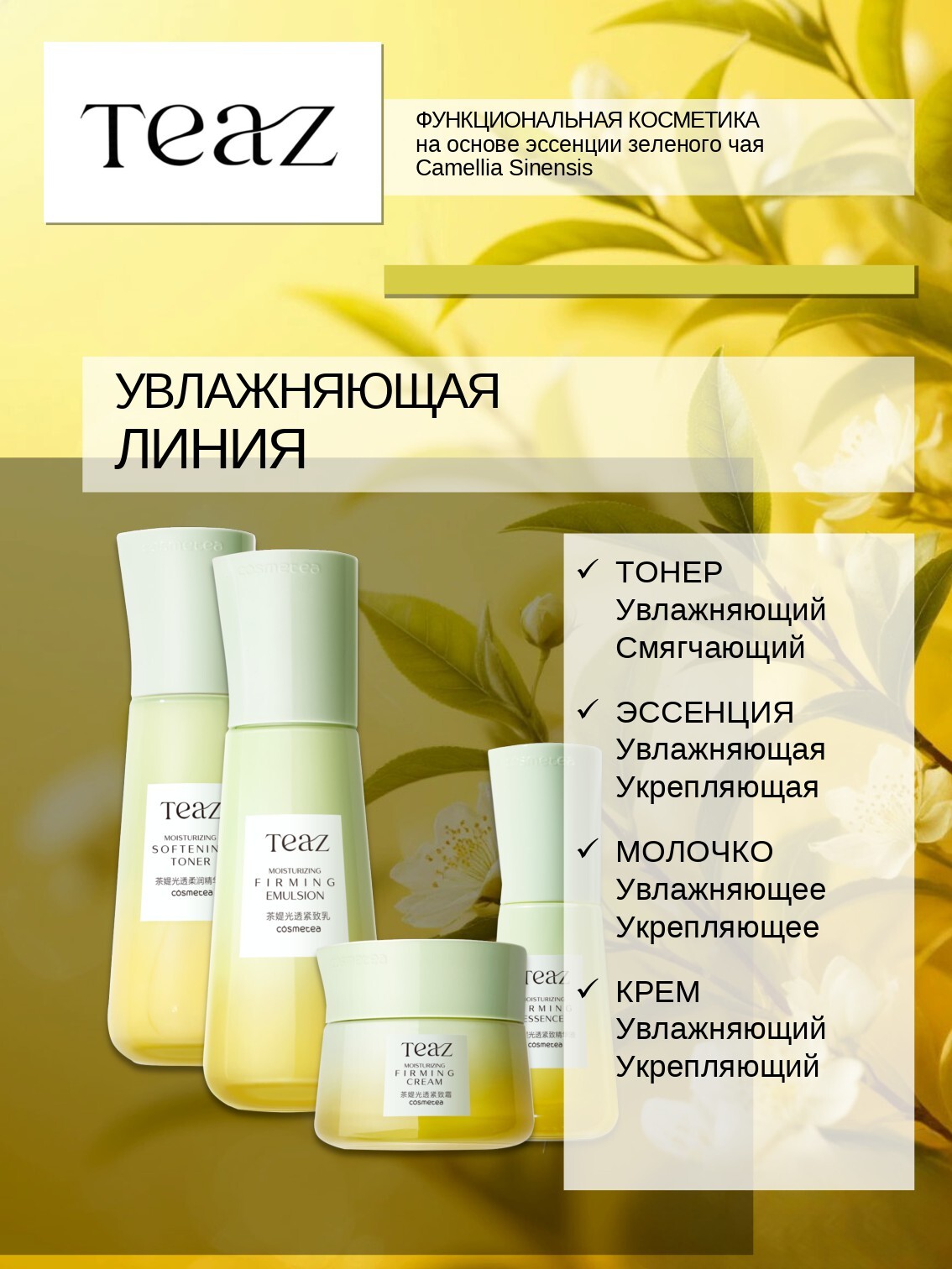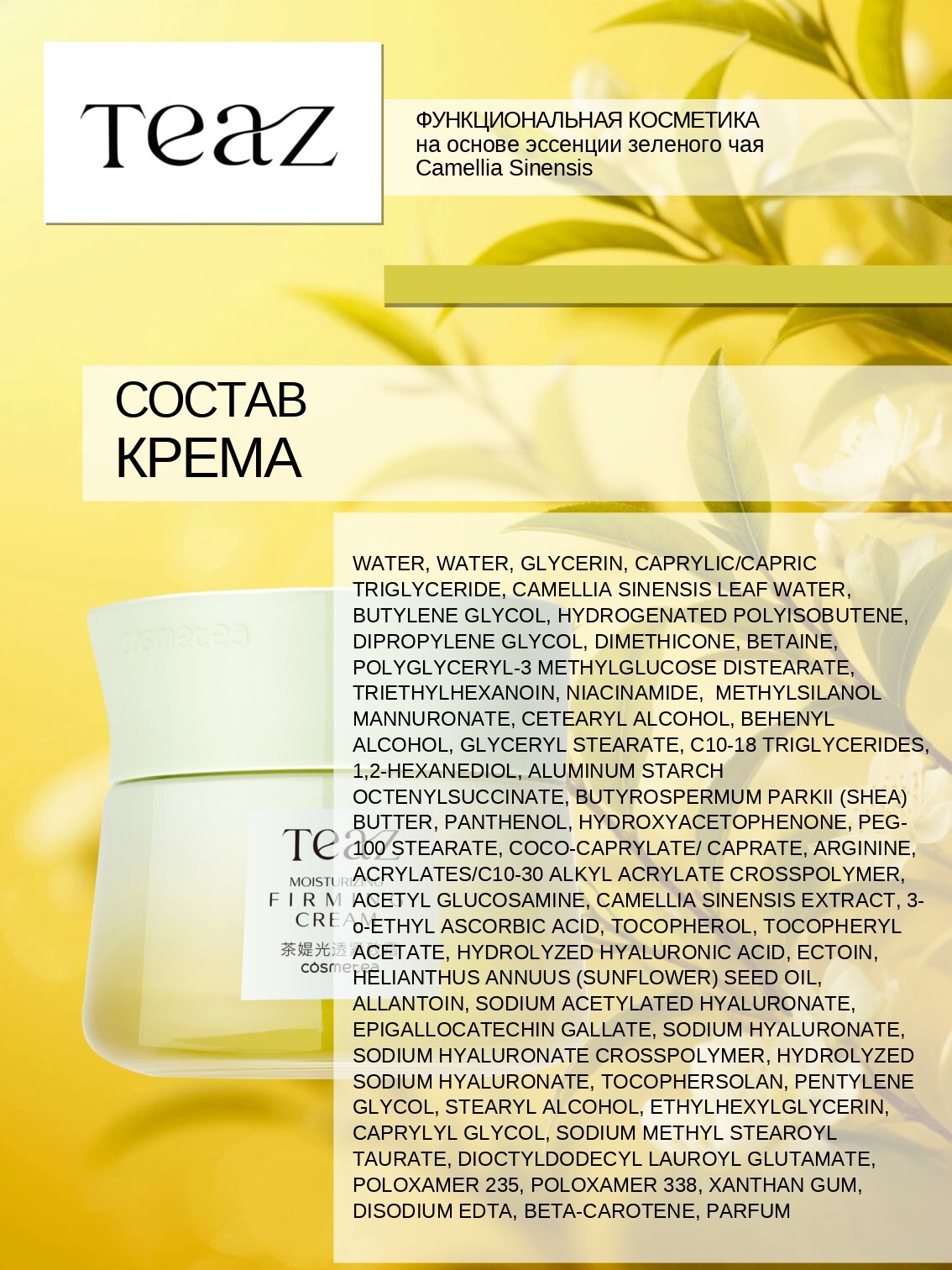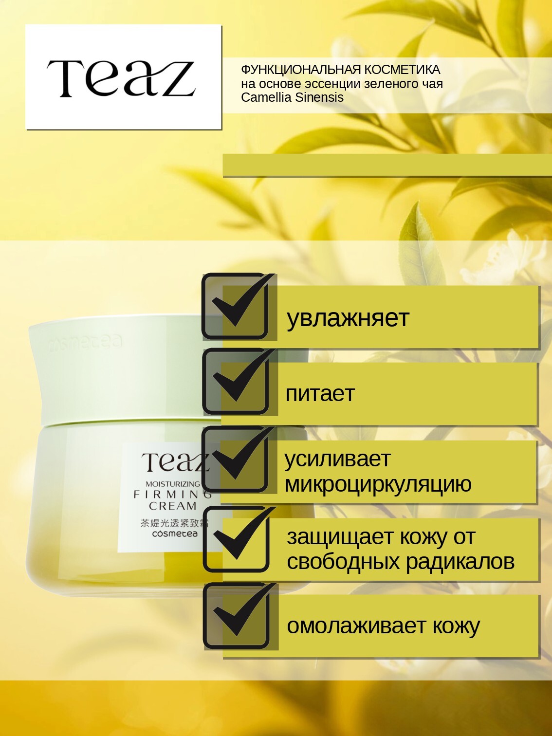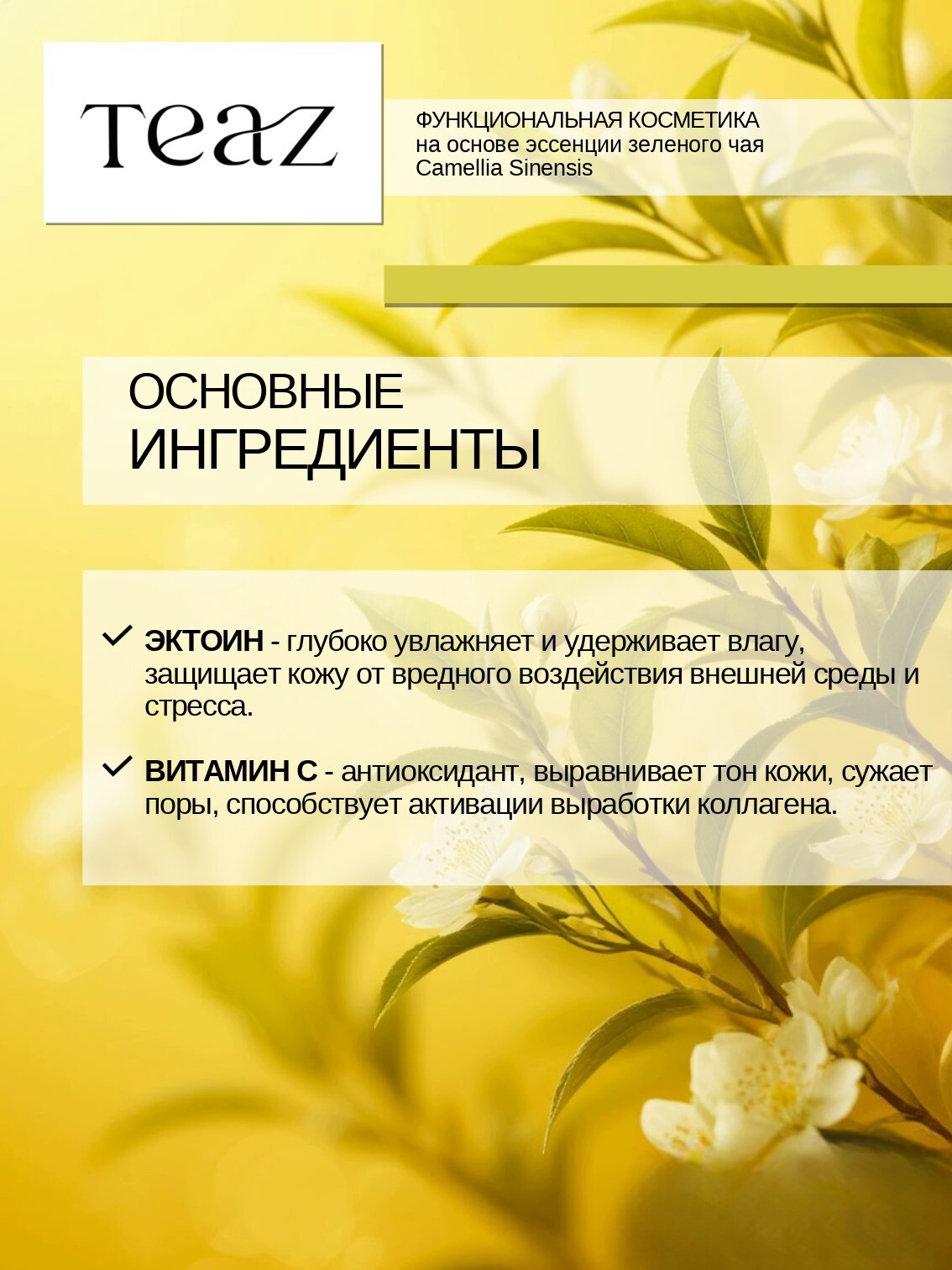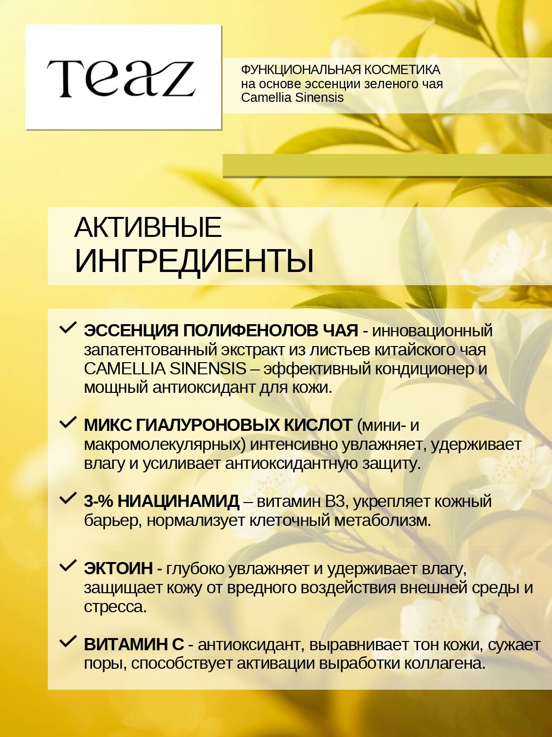 Формула TEAZ с полифенолами, получаемыми из китайского чая, обеспечивает эффективный антиоксидантный уход, защиту от свободных радикалов, обладает увлажняющим и омолаживающим эффектом, защищает кожу от неблагоприятного воздействия внешней среды.