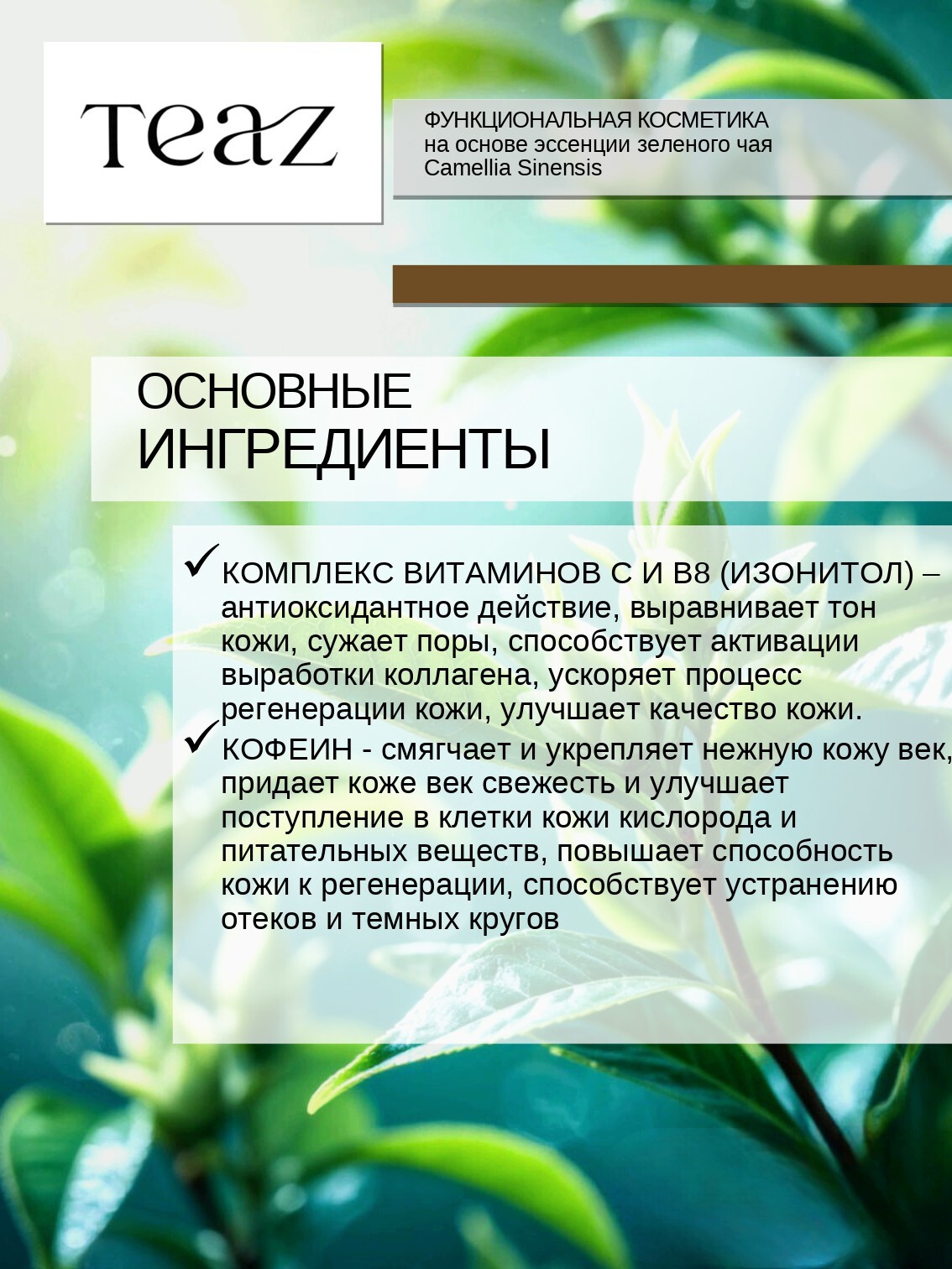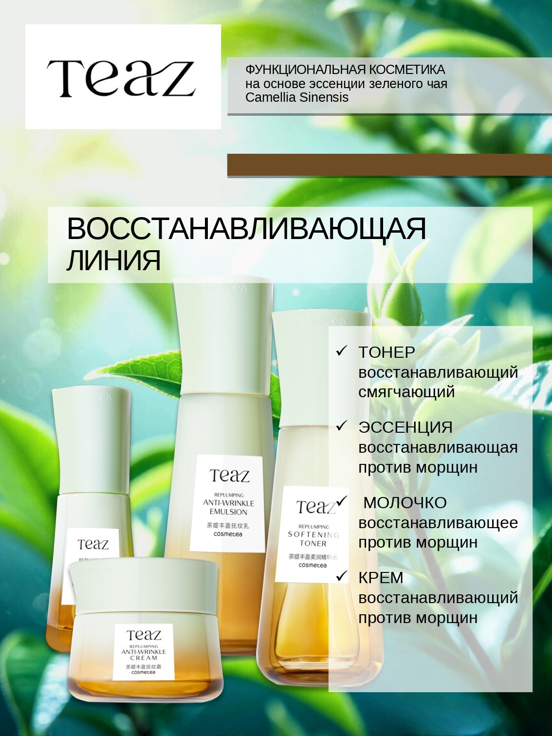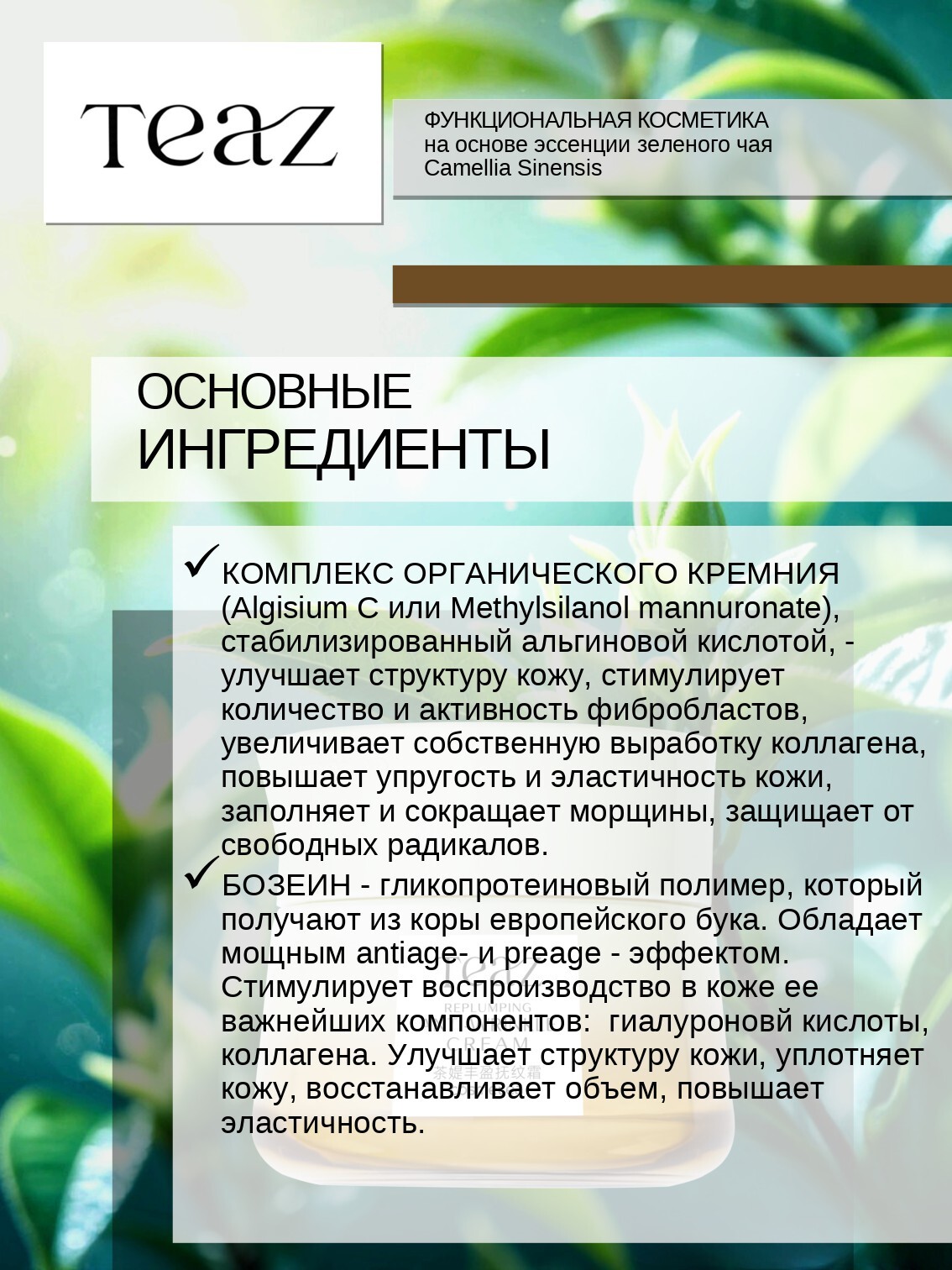 Формула TEAZ для восстановления кожи дополнительно содержит активные натуральные пептиды, которые стимулируют синтез собственного коллагена в коже, повышают плотность коллагеновых и эластиновых волокон, что способствует подтягиванию кожи и сокращению морщин