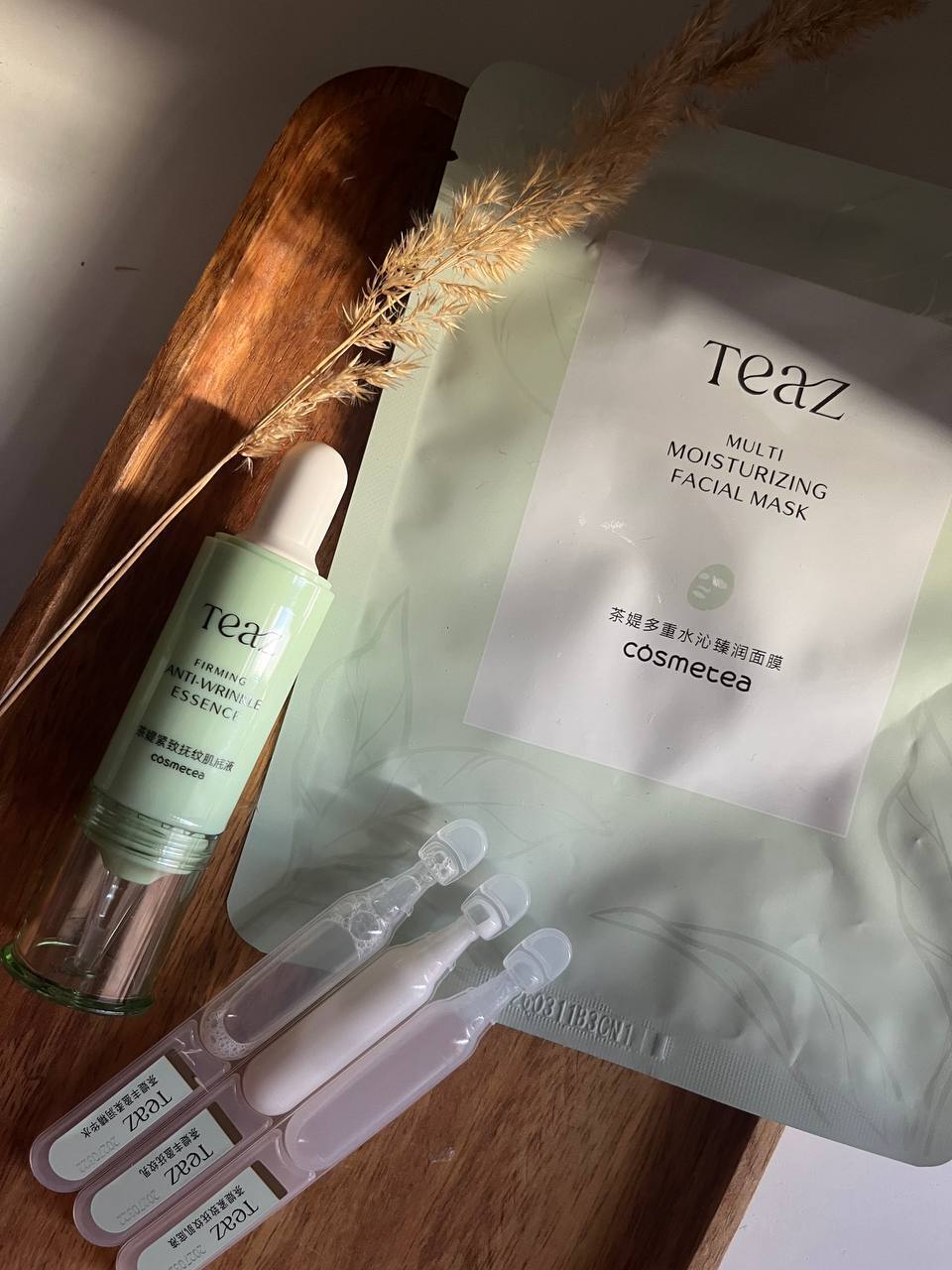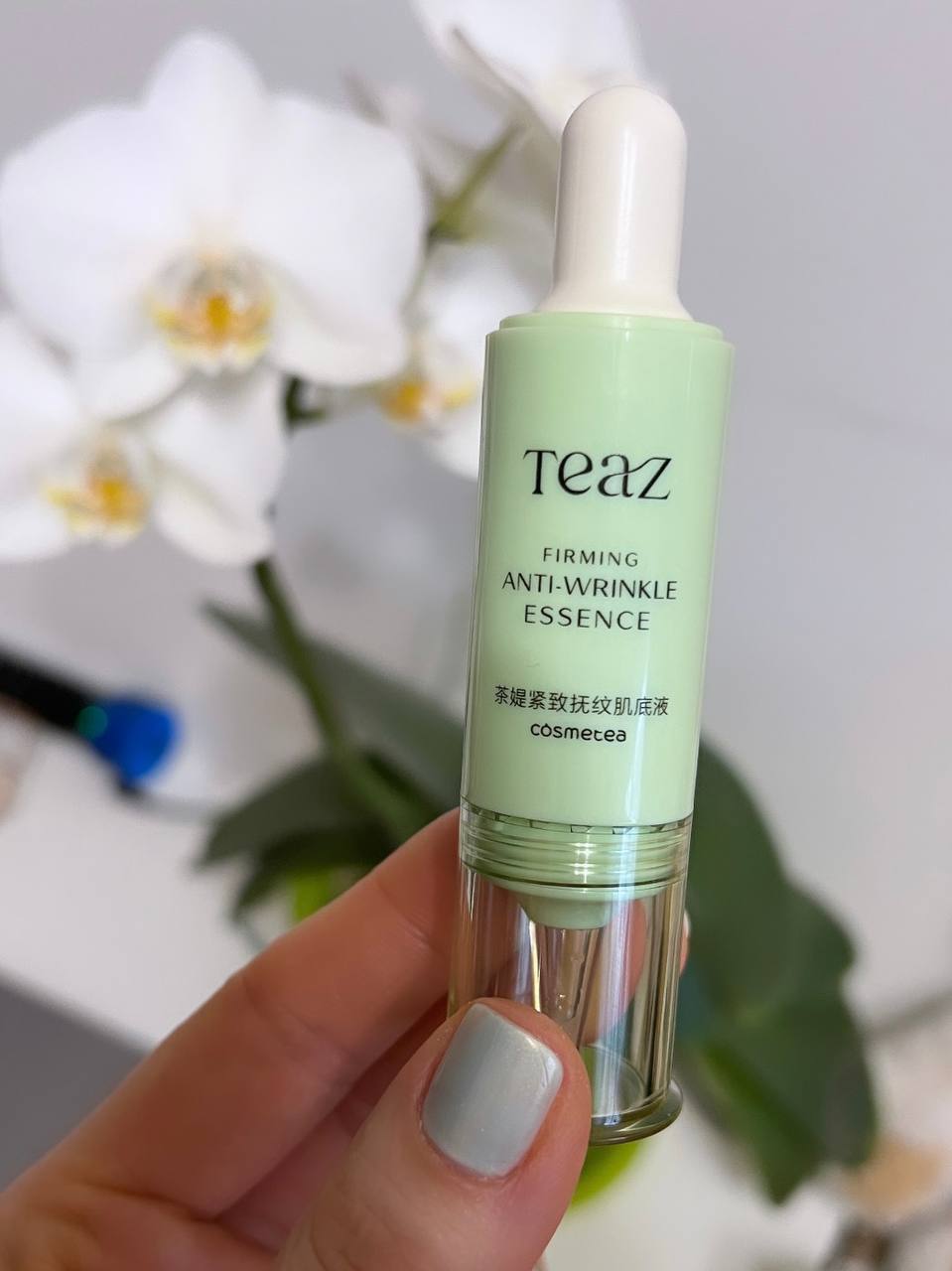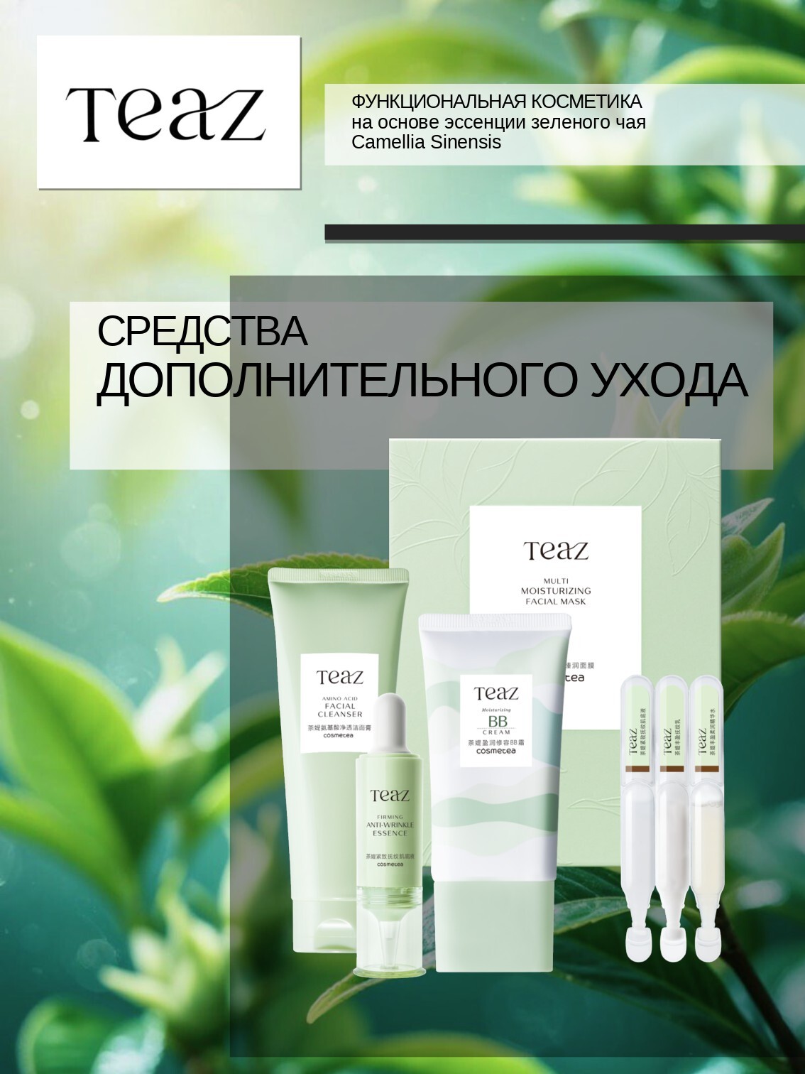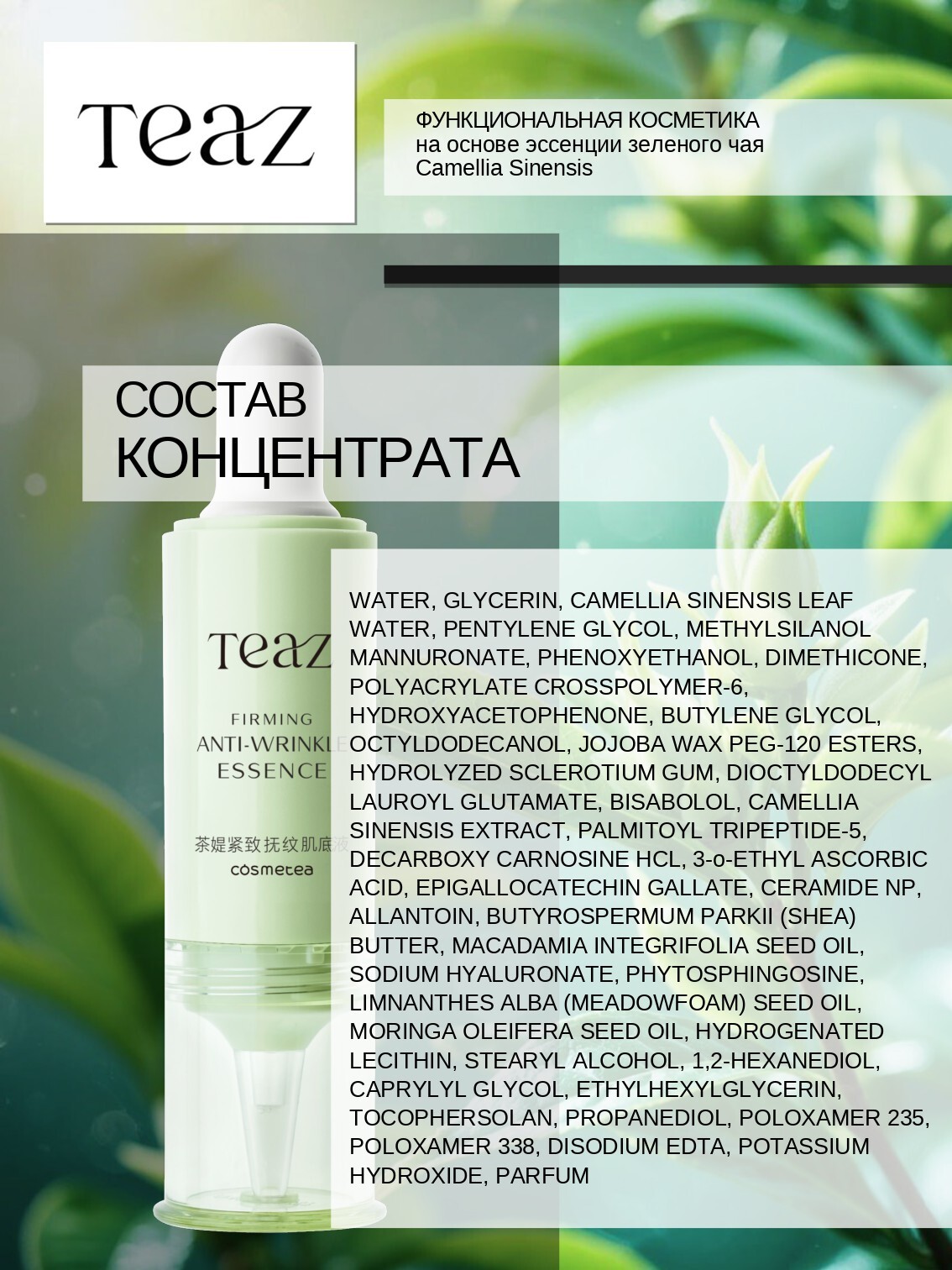 Формула TEAZ содержит комплекс состоит из 5%-эссенции полифенолов, получаемых из китайского чая, керамидов, витамина С, натуральных пептидов и растительного сфингозина. Он насыщает кожу влагой и способствует ее удержанию в коже, подтягивают кожу, сокращает мелкие морщинки, делает кожу упругой и эластичной. Ценные масла дополнительно смягчают, разглаживают и глубоко увлажняют кожу.